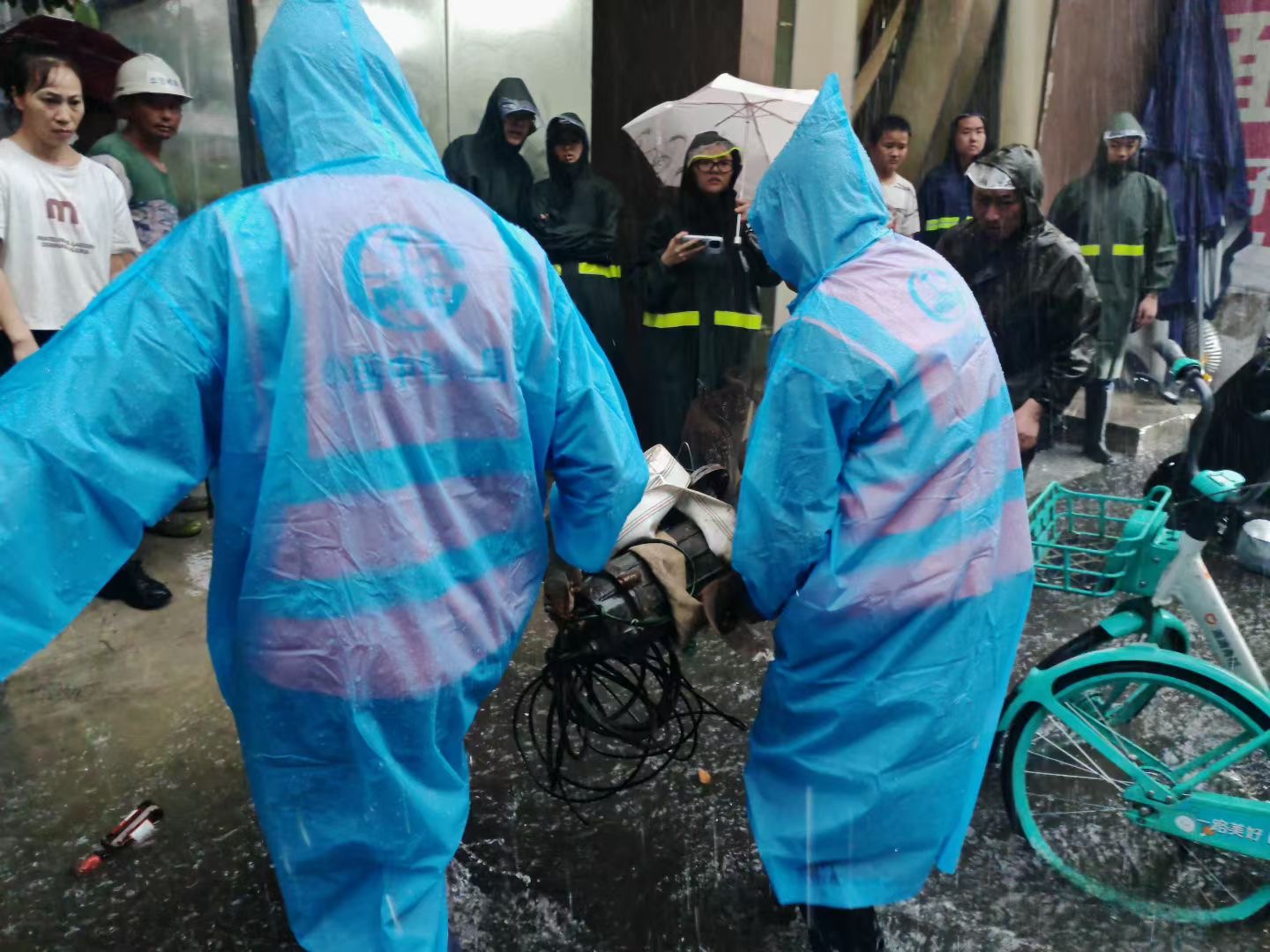 抢险不忘安民,救灾更显温情。在抢险突击队奋战在一线的同时,项目部还组建了5支志愿服务队,为受灾群众送去了抽水泵、抽水带、防汛沙袋、矿泉水、雨衣等应急物资。