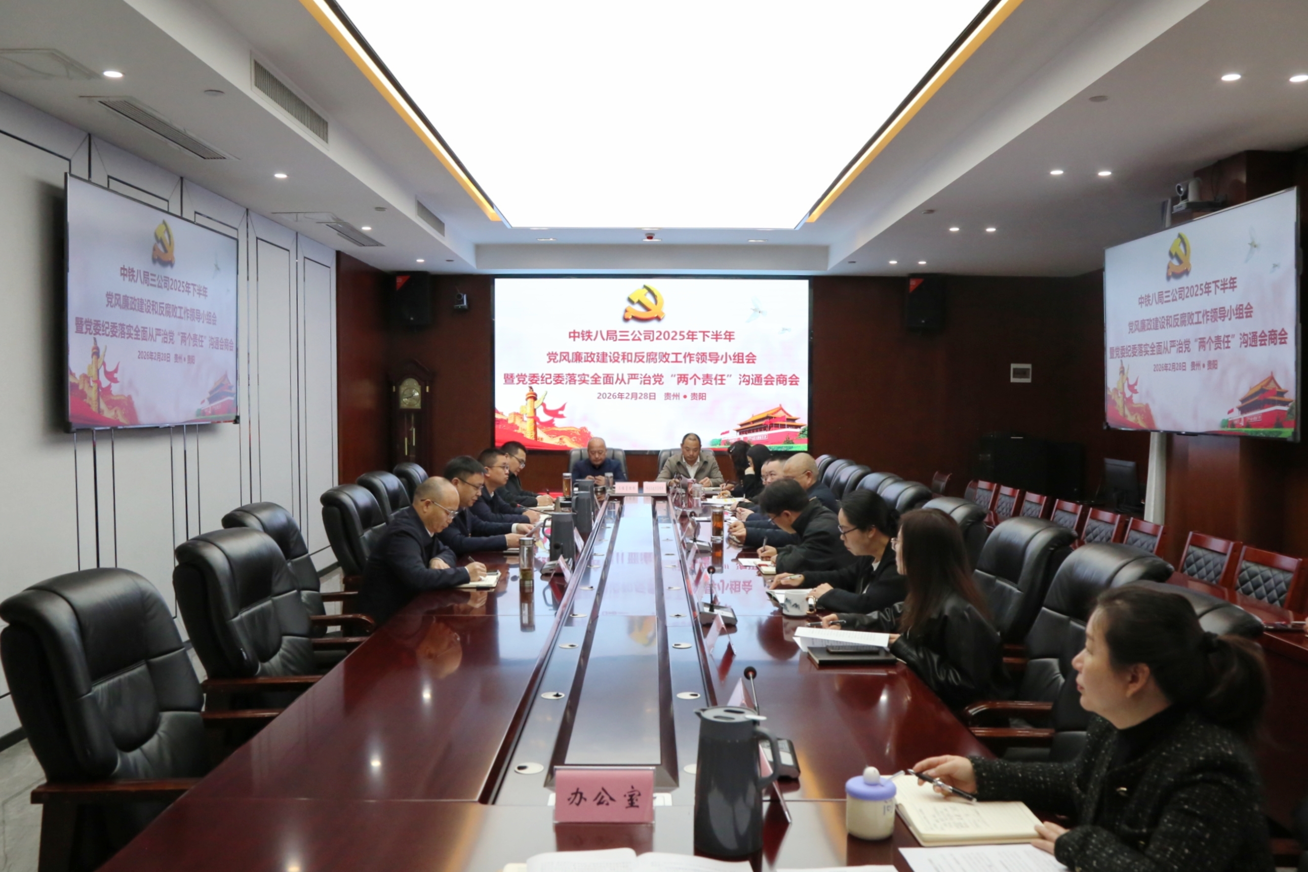2月28日,公司召开2025年下半年党风廉政建设和反腐败工作领导小组会暨党委、纪委落实全面从严治党“两个责任”沟通会商会。公司党委书记、董事长曹火勇主持会议并讲话,总经理、党委副书记李超及在家领导班子、三副总、本部各部门负责人参加会议。