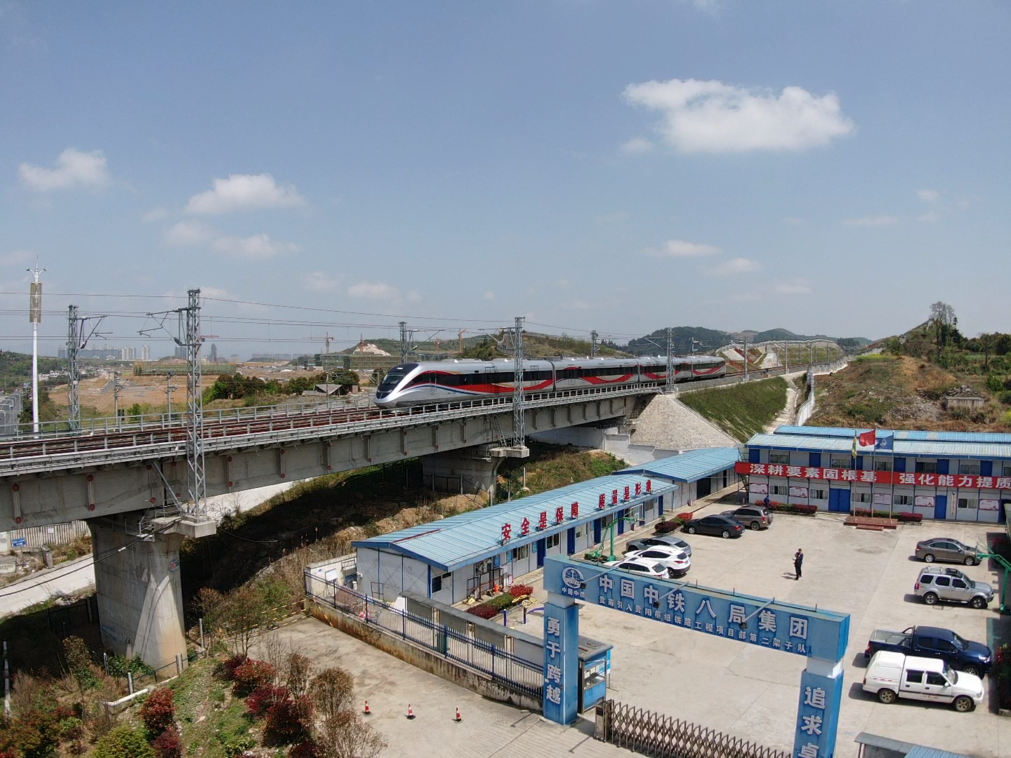 全线控制性工程彭官村二号隧道则与沪昆高铁紧邻并行,施工位置中心距离最短仅为40米。沪昆高铁上下行列车每天63列,设计以350km/h的速度频繁通过,运行时间间隔最近仅5分钟,这让项目建设面临着巨大的安全风险挑战。为保证沪昆高铁运行安全,项目部积极推进创新手段的探索与应用,通过引进动态视频变形监控系统,借助网络技术,对高边坡采取全天候全自动的方式,收集、分析检测数据并联网警示警报,实时保障列车运行与施工安全。然而,隔着高铁列车穿山凿石不单是一项细致活,也是一个极其考验耐心的精巧活。为了避免开挖产生的振动,项目部采用悬臂掘进机进行施工,平均每天掘进速度仅在2米左右,遇到石质坚硬的情况一天进尺仅0.6米,回忆起建设过程,项目施工员谭中才看着车窗外说到“隧道全长676米,建设完成,我们共计使用达1万3千多颗钻头,平均每天损坏19个。”曾经这个“挖不到头”的隧道,如今列车行驶过仅仅用时14秒。