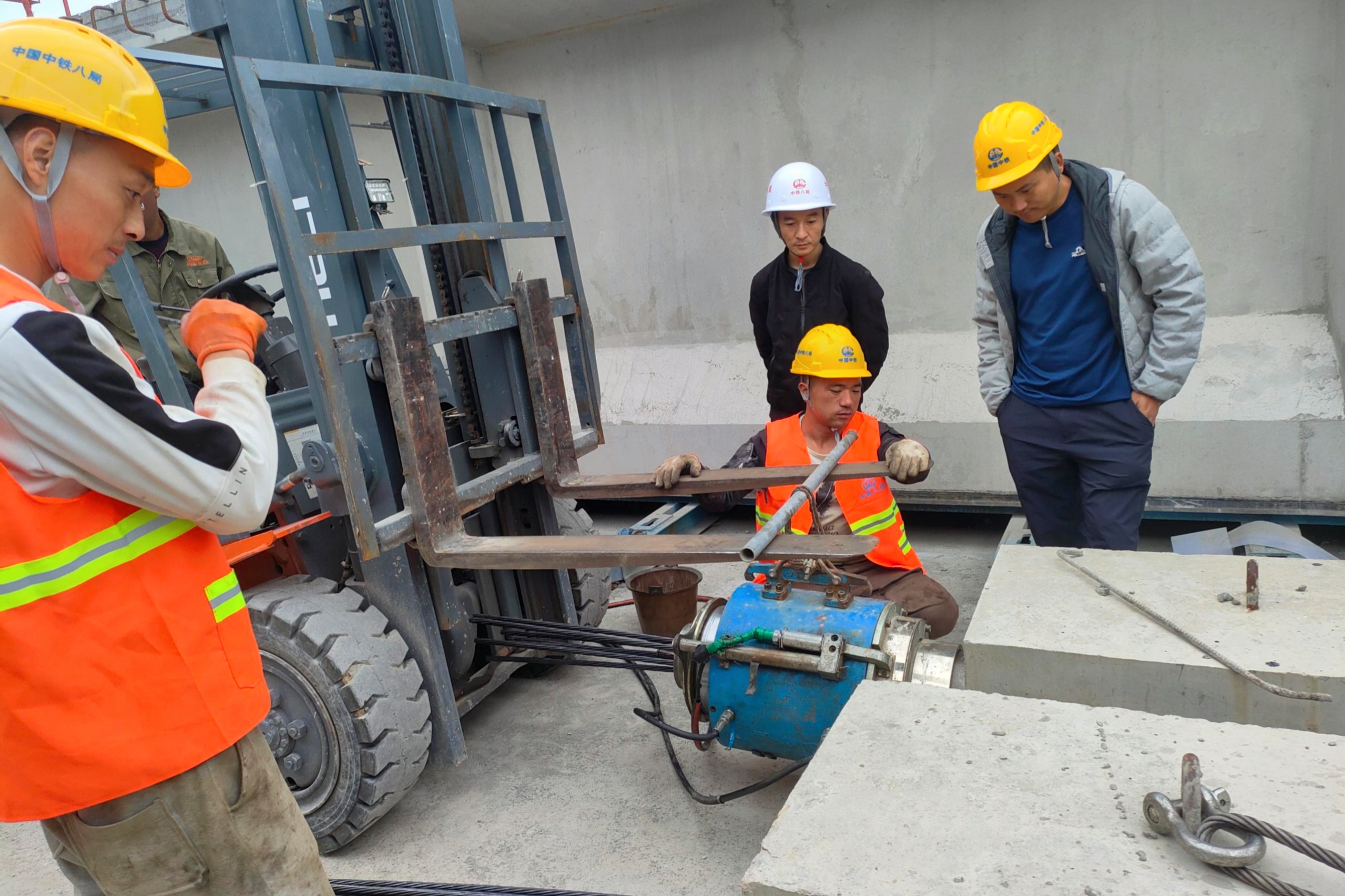 自进场以来,项目部始终坚持以标准化建设为抓手,严格遵循相关标准和规范,合理安排生产计划,积极优化施工方案,对制梁各个环节进行全过程、系统性管控。制梁过程中,项目部始终坚持“首件制”,通过提前对原材料检查、优化混凝土混合比等方式,确保各项指标达到“精品工程”要求。项目技术团队还以打造“智能梁场”为目标,在T梁脱模后利用自动化喷淋养护系统进行养护,较传统人工操作更准时、更均匀、更高效,并采取管道自动压浆系统、预应力自动张拉系统,进一步保证了T梁预制质量。在多措并举严把各项工序质量关的同时,项目部不断优化人材机配置,现场设90吨龙门吊四台、10吨龙门吊三台,高峰时期投入现场施工人员40余人,助推预制工作跑出“加速度”。