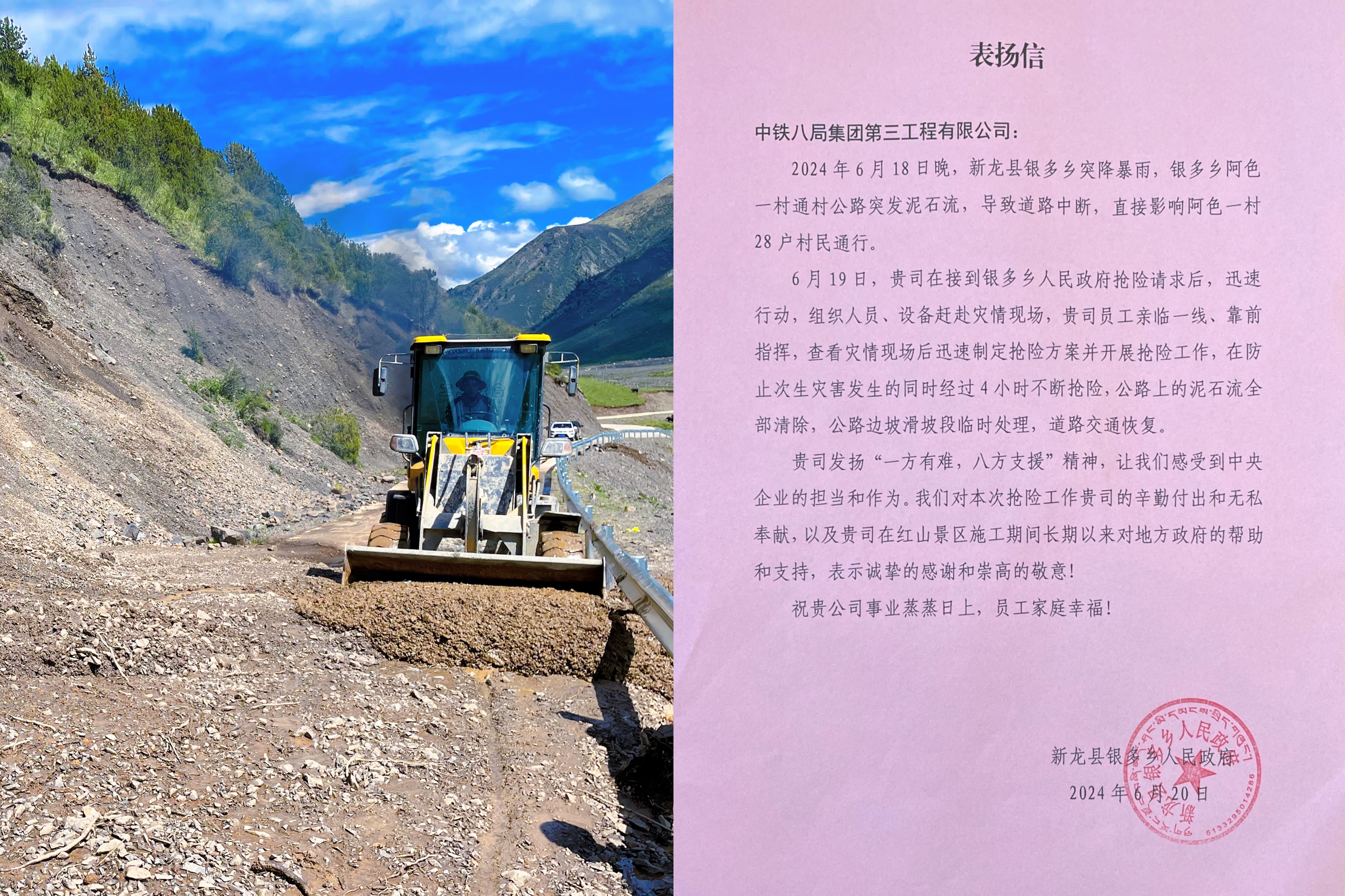 6月21日,四川省甘孜藏族自治州新龙县银多乡人民政府为新龙红山项目送上“心系村民,抢险救灾;无私奉献 央企担当”锦旗和表扬信,对项目部在6月19日泥石流抢险工作中做出的努力与长期以来对地方政府的支持帮助表示诚挚的感谢和崇高的敬意。