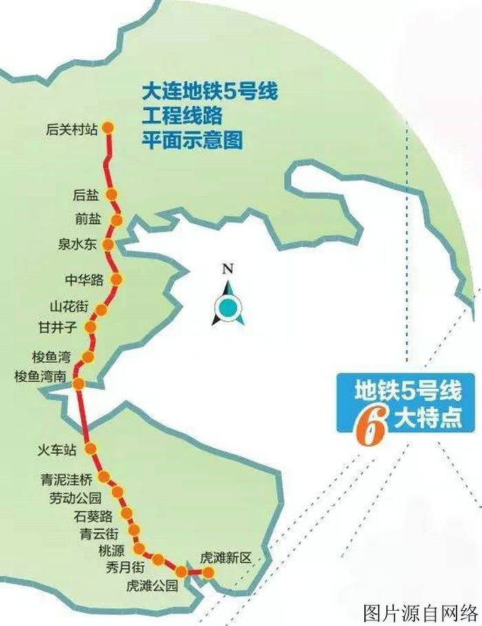 大连地铁5号线是大连市与股份公司合作的首条采用PPP模式建设的轨道交通线路,具有里程碑式的意义,对创新地铁建设融资方式、优化基础设施建设融资平台、加快大连市经济转型升级发展具有重要引领作用。大连地铁5号线工程南起虎滩新区站,北至后关村站,线路全长24.484千米,计划工期5年半。城轨分公司承建该项目的两站三区间,起点-虎滩新区站区间、虎滩新区站、虎滩新区站-虎滩公园站区间、虎滩公园站、虎滩公园站-秀月街站区间,工程概算约为7.5亿元。