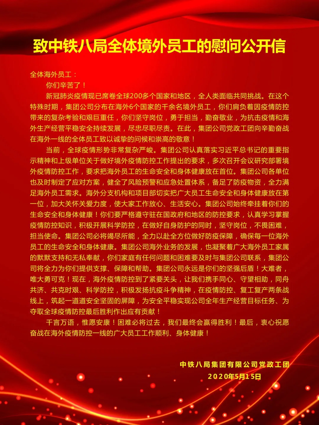 致中铁八局全体境外员工的慰问公开信