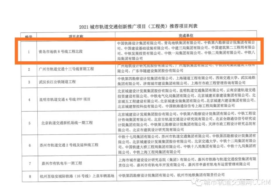 青岛地铁8号线项目被评为“2021年城市轨道交通技术创新推广项目(工程类)”