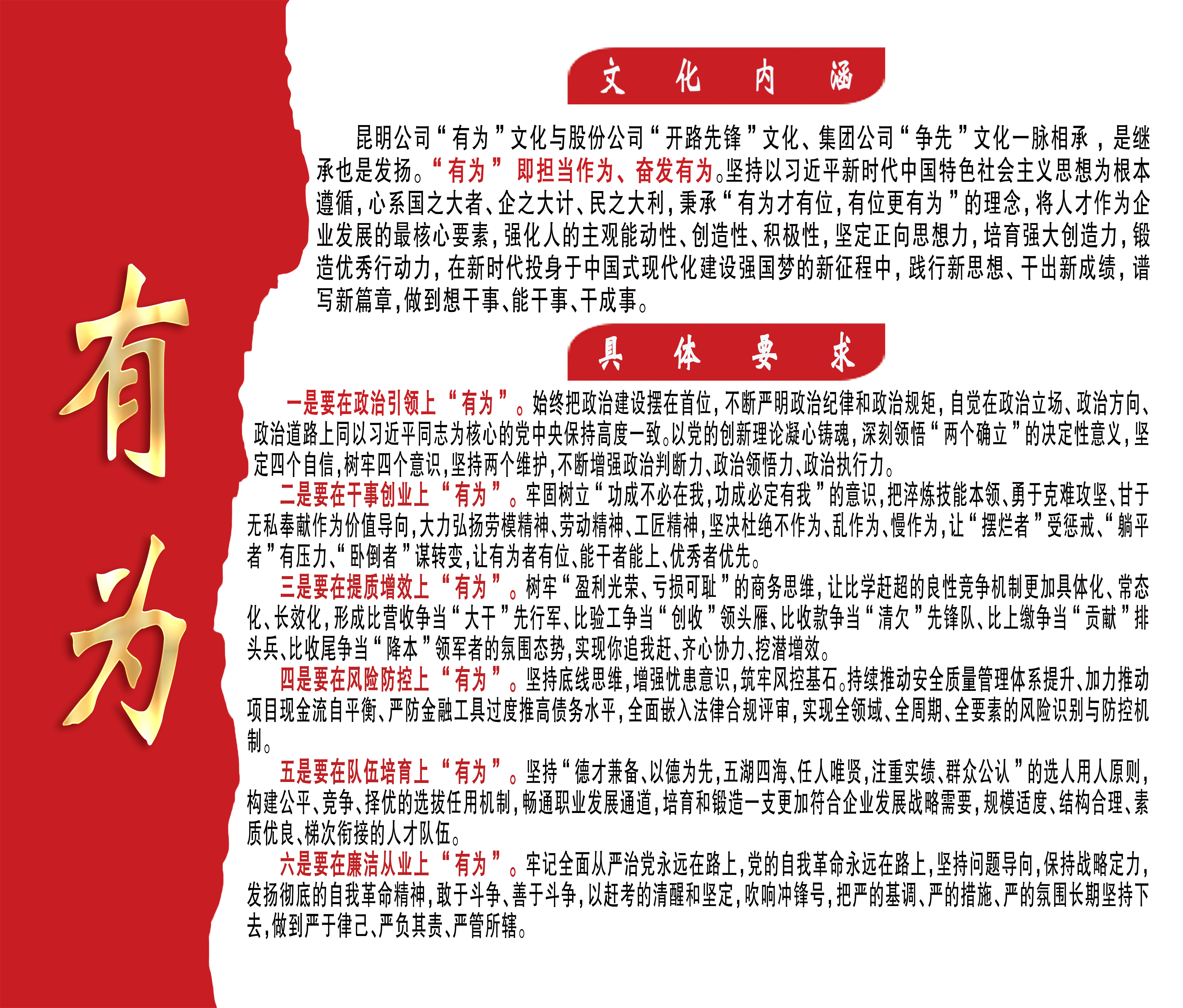 企业员工宣言:我是一名中铁八局昆明公司员工,我珍惜我的工作岗位,我愿与中铁八局昆明公司同风雨、共命运,我工作的安全和质量,关系到企业的发展和荣誉,我郑重承诺:忠诚企业,恪尽职守,团结拼搏,勇挑重担!我坚决做到:认真学习,坚决执行,诚实守信,创造效益,感恩客户!我将以实际行动,奉献建筑精品,造福全社会,为中铁八局昆明公司的和谐强大而努力奋斗!