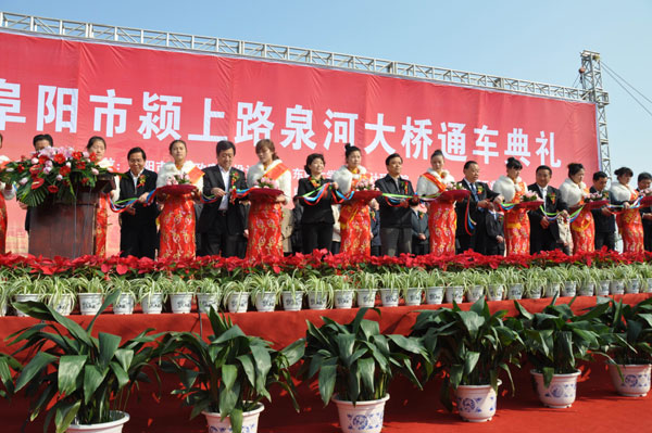 10月26日上午9时36分,阜阳市颍上路泉河大桥上彩旗飘扬,军乐高奏,由中铁八局昆建公司承建的阜阳颍上路泉河大桥工程通车典礼在这里隆重举行。阜阳市人大常委会主任宋家伟,阜阳市委常委、副市长倪建胜,市政府秘书长王显义,市政协副主席兼建委主任陈继民,市政协副主席、建委总工张永侠,颍泉区区委副书记怀自德,集团公司党委书记徐敦美,昆建公司董事长、党委书记徐明辉,东南大学建筑设计研究院院长丁建明等领导参加了通车典礼仪式并为大桥通车剪彩。