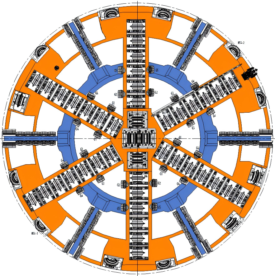 本次下井的“宁核先锋号”泥水盾构机刀盘采用6主梁+6副梁结构设计,整体开口率为38%,总重150吨,是所有盾构部件中重量最大、吊装风险最高的部件。面对风险挑战,项目部统筹部署、系统谋划,建立专项工作机制,围绕设备进场、运输、吊装、拼装等环节,制定精细化实施方案与责任清单,强化资源统筹与现场调度,最终实现了盾构机刀盘精准、高效、安全入井。
