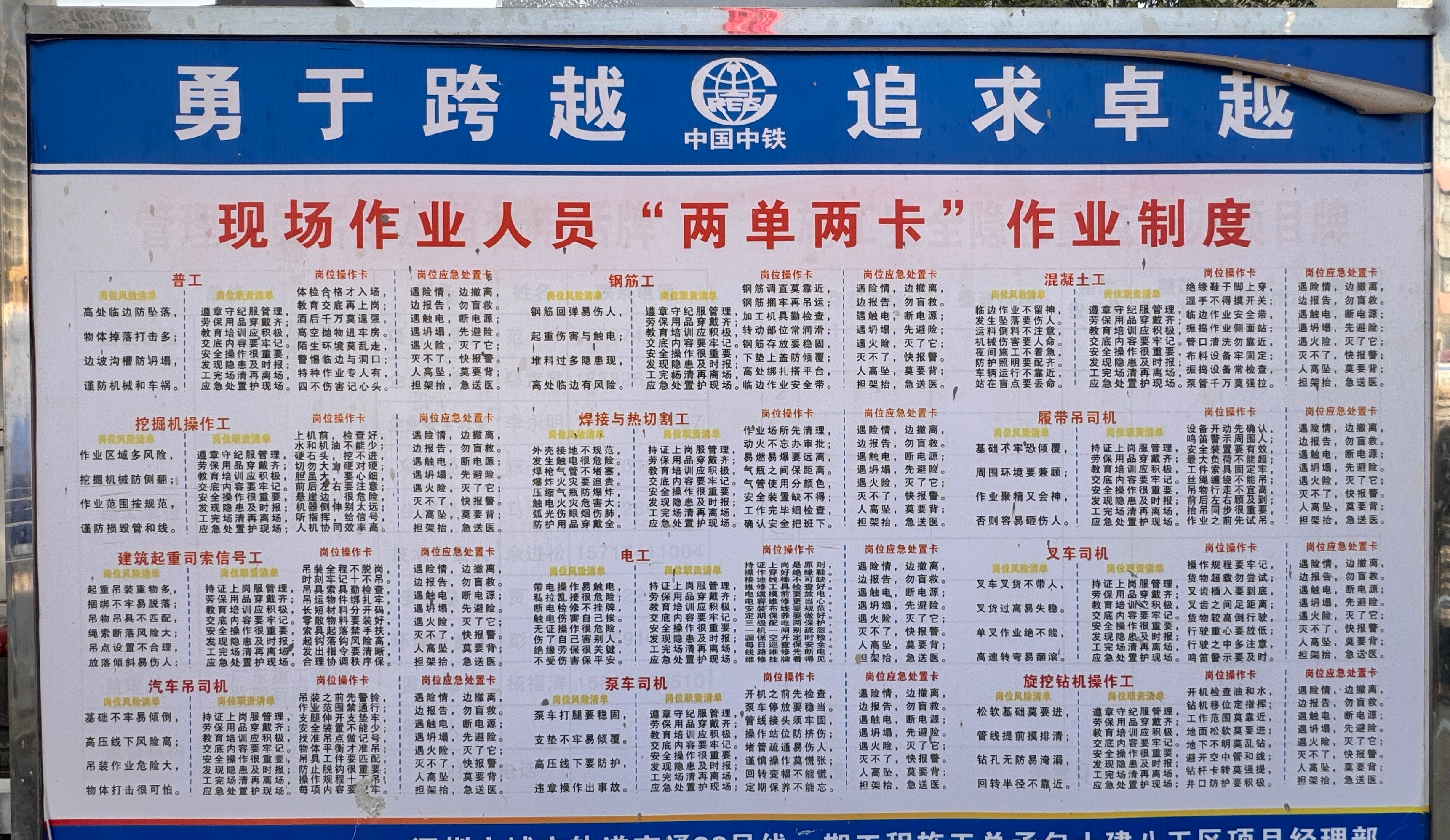 为深入学习贯彻股份公司和集团公司“1号文”精神,持续开展安全生产“雷霆行动”,严格落实安全生产大反思、大整治、大提升专项行动、“三个专项整治”行动以及《中国中铁铁腕治安硬十条》有关工作要求,公司多措并举,积极开展“两单两卡”推行活动,进一步增强一线岗位人员的安全意识、提升安全操作技能、强化应急处置能力,全力打通安全管理“最后一公尺”。