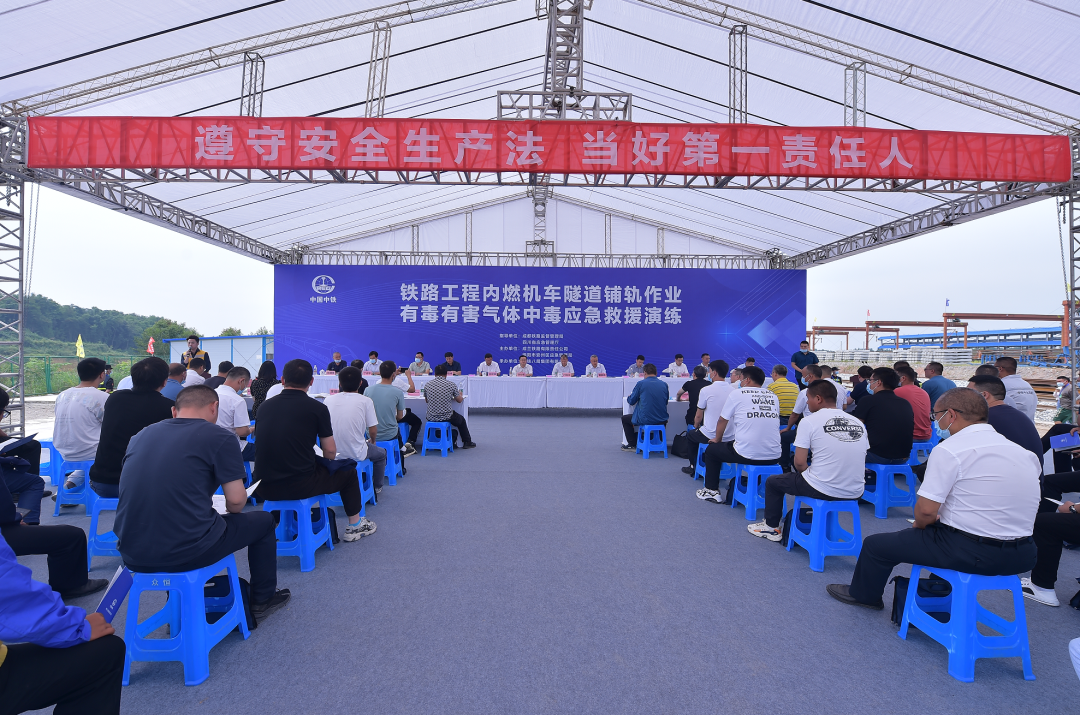 ▲全国首次铁路工程内燃机车隧道铺轨作业有毒有害气体应急演练在川青铁路施工现场举行