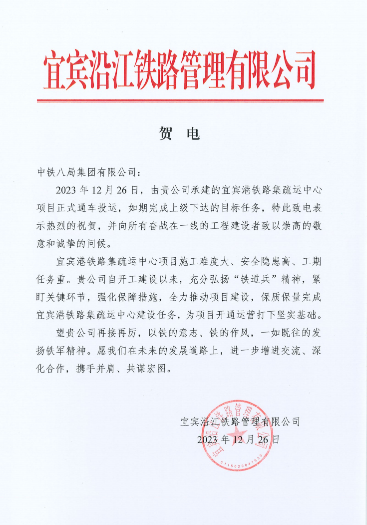 12月26日,宜宾港铁路集疏运中心专用铁路正式投入运营,宜宾沿江铁路管理有限公司发来贺电,对中铁八局宜宾港铁路项目部顺利完成范围内施工任务表示热烈祝贺,并向所有奋战在一线的工程建设者致以崇高的敬意和诚挚的问候。