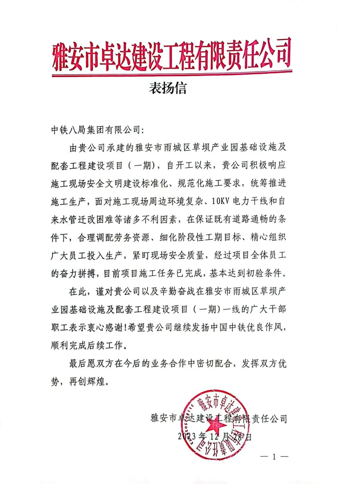 12月28日,雅安市卓达建设工程有限责任公司向中铁八局雅安片区项目部发来了表扬信,对项目部以实际行动高效扎实推动施工生产工作予以表扬,对辛勤奋战在雅安市雨城区草坝产业园项目一线的广大干部职工表示衷心感谢!