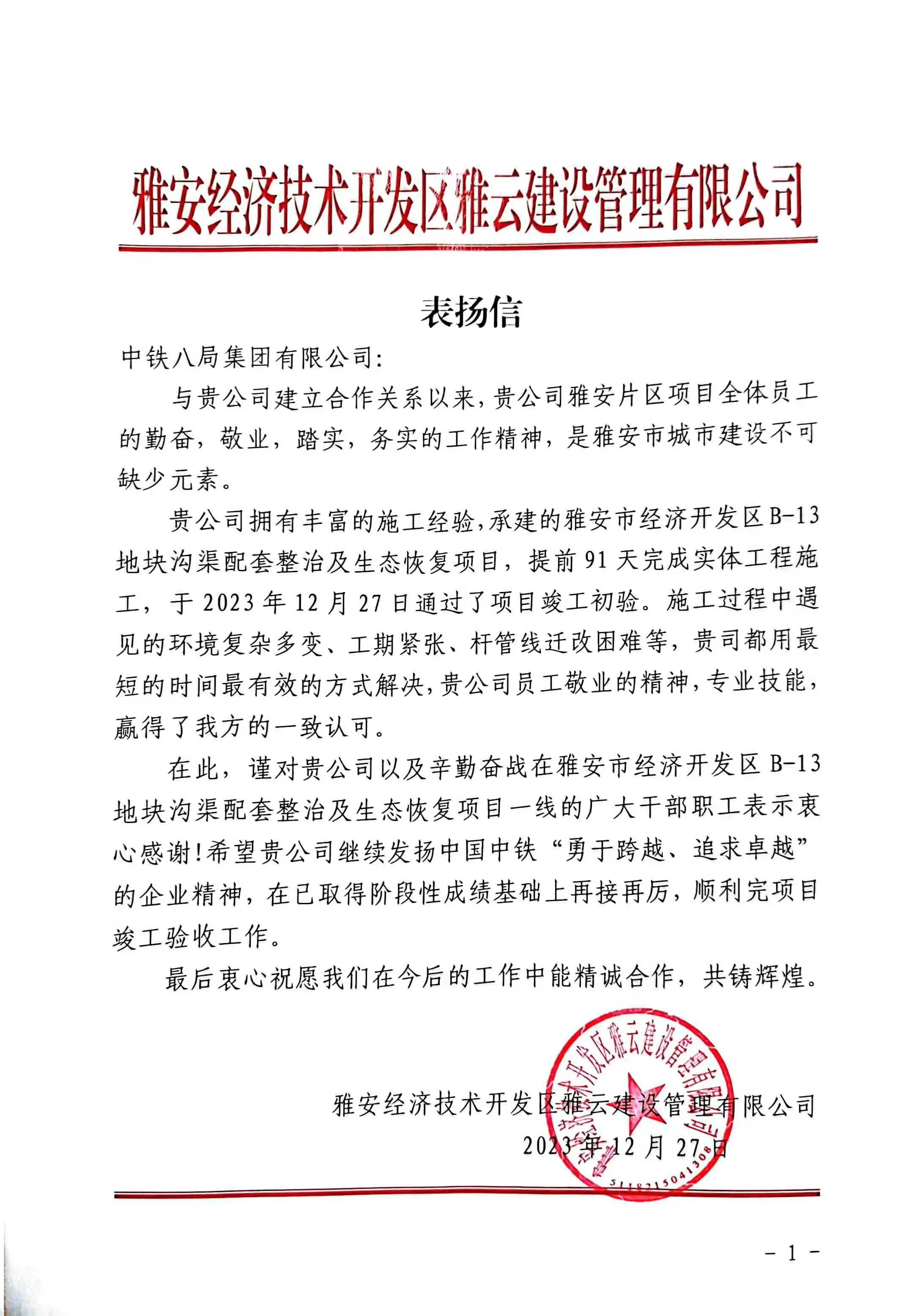 12月27日,雅安市经开区市政工程项目通过了竣工初验,并喜获业主单位雅安经济技术开发区雅云建设管理有限公司表扬信,对中铁八局雅安片区项目部全体员工勤奋,敬业,踏实,务实的工作精神高度赞扬。