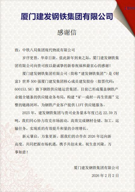 与此同时,厦门建发钢铁集团有限公司在感谢信中,对公司在2025年的紧密协作给予高度评价。过去一年,面对复杂多变的市场环境,双方携手攻克市场波动带来的挑战,在钢材仓储、加工、运输等环节配合默契,实现了业务量的显著增长与服务质量的稳步提升。厦门建发钢铁集团有限公司特别提及,2025年度双方业务量已达22.59万吨,这一成果的取得,离不开双方团队的并肩作战与不懈努力。